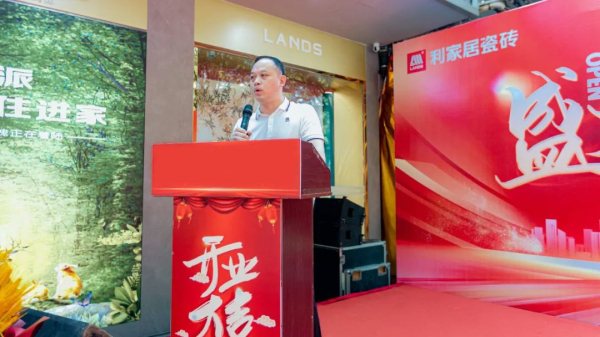 利家居瓷磚營銷總經理陳東榮上臺為本次開業盛典致辭,向現場遠道而來的經銷商朋友們表示熱烈的歡迎和衷心的感謝。陳總表示,利家居瓷磚今天的輝煌是在所有家人們與在座嘉賓朋友們風雨同舟、互利共惠、親密合作的基礎上共同創造的。隨著利家居品牌知名度和市場需求的不斷擴大,公司將在產品升級、形象升級、營銷升級三大板塊中穩步提升。未來,我們將繼續堅持以市場需求和時尚潮流為導向,創新研發新品,為各位合作伙伴家人們提供更具競爭力的優質產品和服務,實現廠商共贏共享,共同創造利家居瓷磚的美好明天。