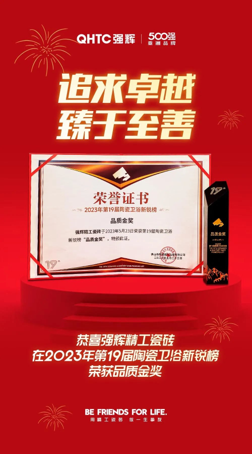 5月23日,被譽為“行業奧斯卡”的2023第十九屆陶瓷衛浴新銳榜頒獎盛典在廣東佛山新媒體產業園·云空間隆重舉行,廣東強輝陶瓷有限公司(以下簡稱“強輝”)憑借雄厚的企業實力和過硬的產品品質,一舉奪得“品質金獎”,用硬核實力說話!