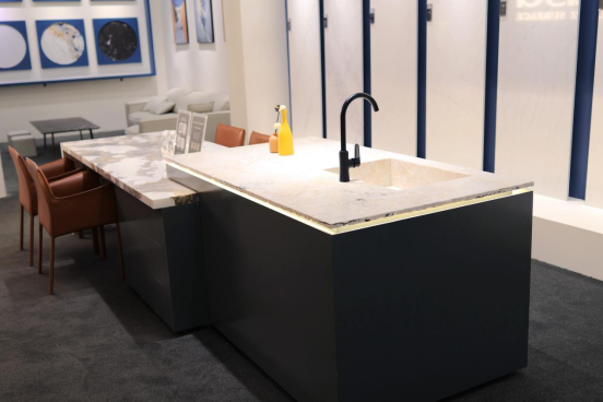 第三代皮紋工藝受到參展觀眾的極大關注,產品復刻自然紋理的斧鑿立體感,質感更加高級,法薩石產品特色充分展現出石英石材料的無限可能,從傳統的廚房臺面到墻面、地面鋪裝應用裝飾,為空間帶來個性化的裝飾搭配,盡顯萬物皆可石英石的巨大發展潛力和市場前景。