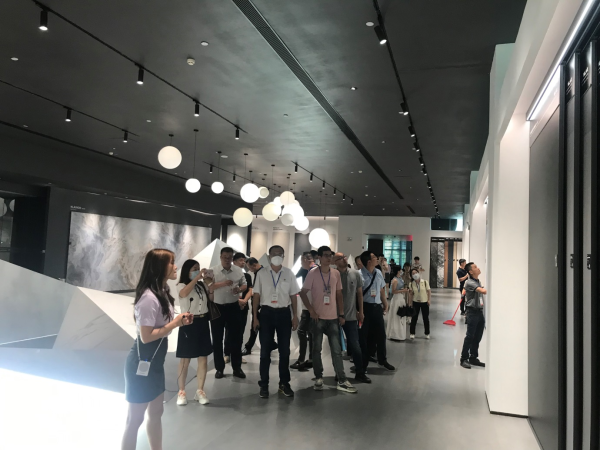 學(xué)員們首先到達廣東金意陶陶瓷有限公司總部,廣東金意陶陶瓷集團有限公司副總經(jīng)理胡杰親自接待了培訓(xùn)班學(xué)員的參觀,在一樓大堂,湯老師與禪城陶協(xié)相關(guān)負責人簡單介紹當天參觀的相關(guān)流程。而后,學(xué)員們在胡總以及講解員的帶領(lǐng)下,參觀了金意陶一到三樓的公司文化和產(chǎn)品種類,參觀過程中,學(xué)員們通過拍攝方式記錄所見所聞。