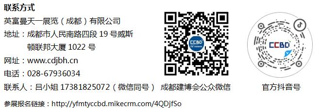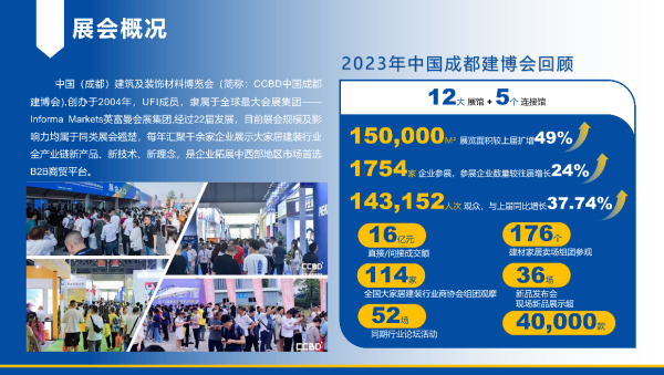 中國(成都)建筑及裝飾材料博覽會(簡稱:CCBD中國成都建博會)創辦于2004年,是全球展覽業協會(UFI)認證展會,展會規模已躍居全國同類展會前列。CCBD中國成都建博會一直致力于為全國建材家居廠家、經銷代理商、房地產開發商、建設/裝飾單位提供專業的商貿合作渠道,打造大家居建裝行業以“經銷代理”和“公裝集采”為核心的優選平臺。在深度把握成渝地區雙城經濟圈建設戰略機遇,依托成渝地區的產業集群優勢,2023年開始在重慶地區打造CCBD中國重慶建博會,逐步形成“成渝雙展”4月成都10月重慶雙城發展的新格局。