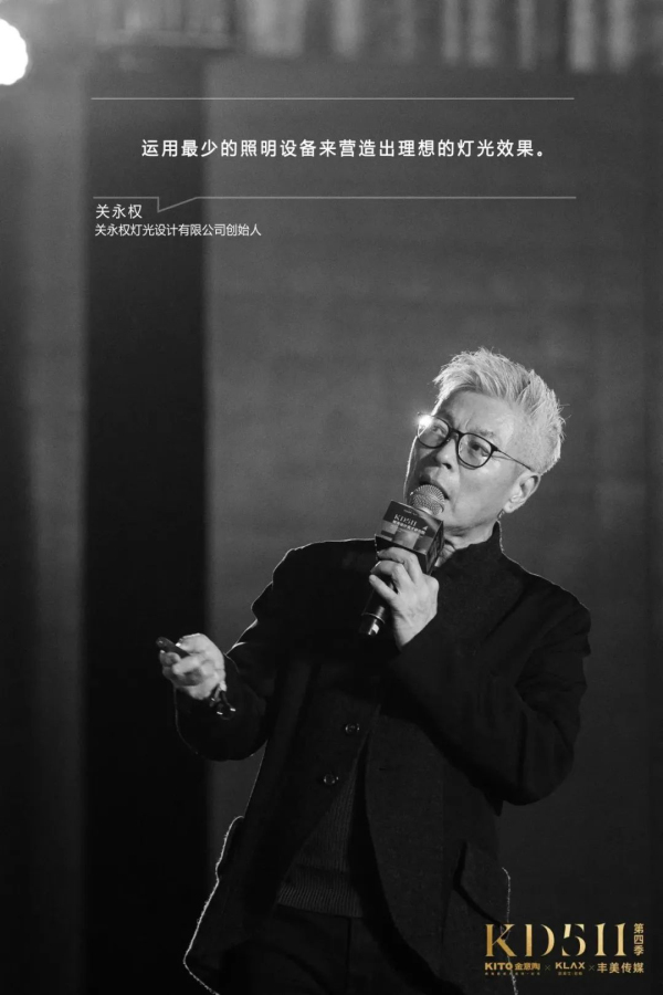 關永權老師的燈光分享,首先圍繞燈光設計的價值展開,它的意義在于營造空間感及視覺吸引力,創造特定的氛圍和情感,塑造層次及重點,創造戲劇性效果,提升藝術品的展示效果,藝術與科技結合。從專業手法上,燈光設計要有重點、有層次、有情感、有氣氛。明暗相結合,而不是通體照亮,要明暗交替,光影相隨。