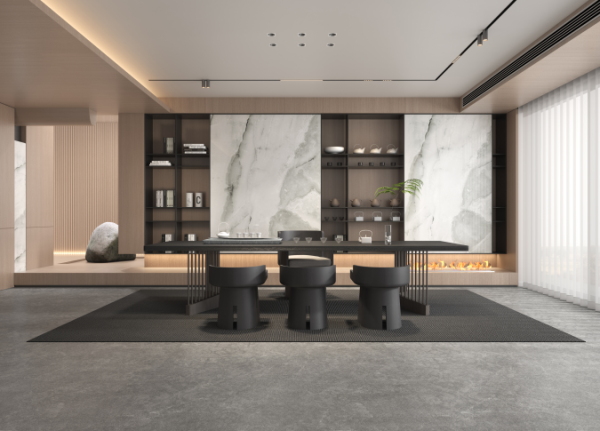 通過精工奢石和純粹的色彩創造出自然的效果,白色精工奢石與黑色的茶桌相互搭配,高級又時髦!茶室沒有太復雜的設計,也沒有繁重的家具,讓空間更通透敞亮。
