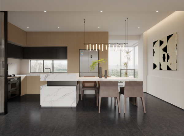 寬闊明亮的空間可以為我們帶來心靈上的釋放,開放式的廚房,讓家的溫馨感更加濃厚,原木風櫥柜與白色的奢石島臺組成最強CP,既顯沉穩又顯高級操作分區明確,合理的動線節省做家務的時間,賦予了廚房更多的可能性。