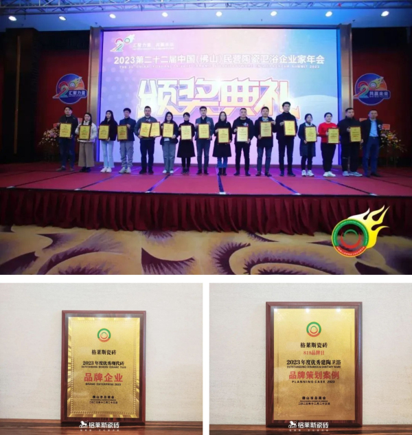 格萊斯瓷磚多年來持續的產品設計與工藝技術深耕,持之以恒的品牌建設打造,得到了年會組委會認可,會上被授予“2023年度優秀現代磚品牌企業”榮譽,【格萊斯瓷磚——818品牌日】更斬獲“2023年度優秀建陶衛浴品牌策劃案例”。