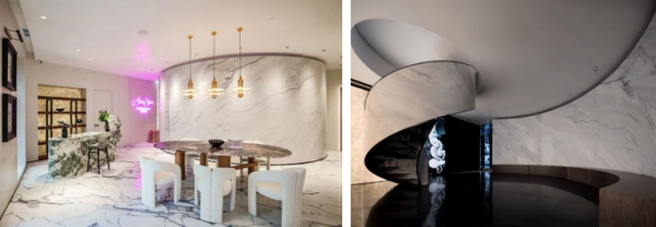 作為新一代高品質的新型綠色建材,歐若拉精工奢石突破多項技術壁壘,構建新石材生態,產品融合了綠色環保、可彎可曲、強力防污、超硬耐磨、極限超薄、透光溢彩等一系列優越技術,其豐富的多樣性造就了奢石在室內設計中的全場景運用,由表及里的真實紋理展現高價值質感與獨特品味更優于天然石材,每一塊奢石都有濃厚的文化氣息和獨特的藝術氣質,天然紋理與色彩的組合,讓奢石具備了獨一無二的珍貴屬性,以原創設計為全球奢宅和豪宅提供奢石高定空間應用方案。