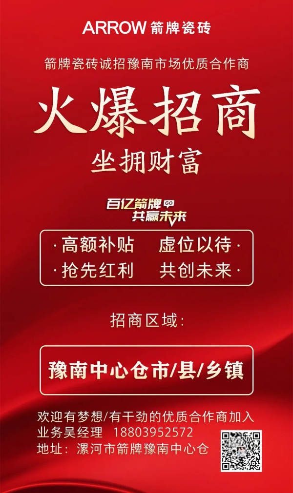 與強者為伍,終成強者!箭牌瓷磚豫南中心倉誠招合作商,期待與您共掘陶瓷行業萬億藍海!