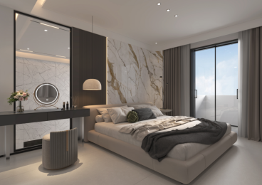 臥室整體設計精致而考究,在材質上,通常選擇高級的奢石、實木等材料,突出空間的現代感和高端氛圍,流暢的曲線消除了方向感,予人安謐的視覺享受及現代簡約氣韻的蔓延滋長,在突出品質感與細節處理的同時,注重色彩與造型的渲染。