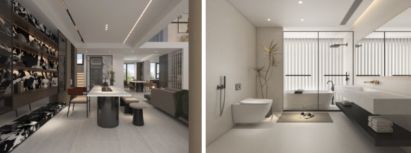 茶室空間通過溫暖的暖光燈和開放式布局獲得了舒適性和親切感,新中式木椅增添了一抹現代感,而黑白大花紋奢石則為室內帶來了藝術氣息。衛浴空間以純白風格為主,墻面與地面均采用了簡潔白色系奢石,在純粹的視覺感受中,沉淀出微妙的平衡與記憶,更在光影的映襯下展現出獨特的美感。