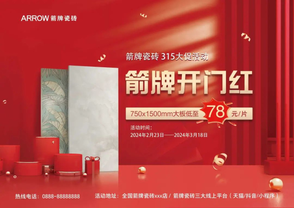 2月23日-3月18日,箭牌瓷磚315開門紅大促活動正火熱進行中,750x1500mm大板低至78元/片,以多重驚喜和寵粉福利回饋消費者對品牌的喜愛。