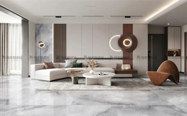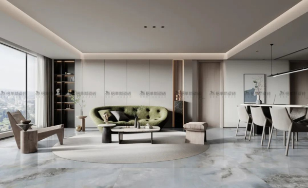 高精度拋光打造磚面透亮的光澤,大面積鋪貼營造明亮開闊的環境,有效提升空間舒適度,搭配奶白色、咖色的家具、裝飾,輕松呈現富有個性的美拉德風。