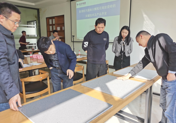 2024年3月23日,宏宇集團“防滑防污通體大顆粒花崗巖瓷磚的關鍵技術及產品開發”科技創新項目在廣西桂林理工大學進行項目成果評價,被認定達到“國際領先水平”!