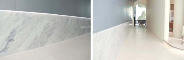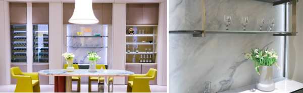 歐若拉精工奢石以精奢探索材料與空間的應用新模式,借助藝術手法展現空間與自然的和諧對話。質感十足入墻式透光酒柜錨定了視覺的焦點,白松露奢石紋理遠觀自然寫意、近看肌理似光線穿透墻面曬落的斑駁疏影,創造出一方獨特且更富有想象力的天地。