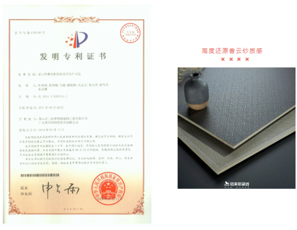 2011年格萊斯瓷磚所屬的新明珠集團就已率先申請發(fā)明專利,并于2014年獲得《香云紗雅光釉瓷磚及其生產(chǎn)方法》發(fā)明專利授權(quán)。有了這項專利技術(shù)的加持,讓佛山非遺與佛山瓷磚的融合變成了可能。