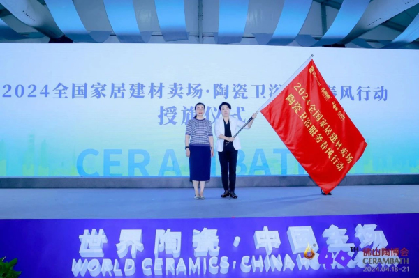 為進一步助力經(jīng)銷商轉(zhuǎn)型升級與發(fā)展,提供更加優(yōu)質(zhì)與系統(tǒng)性服務(wù),佛山陶博會與中國建筑材料流通協(xié)會家居市場專委會聯(lián)手,推出“2024全國家居建材賣場·陶瓷衛(wèi)浴服務(wù)春風行動”。在開幕式現(xiàn)場,中國建筑材料流通協(xié)會副會長兼常務(wù)秘書長、家居建材市場專委會主席張彩虹向佛山中陶城集團副總裁、中國陶瓷衛(wèi)浴總部總經(jīng)理、中國淄博陶瓷總部總經(jīng)理湯潔明授予旗幟。