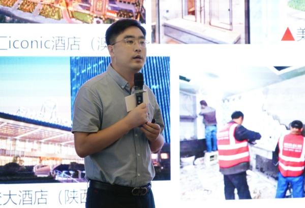 新明珠集團明珠科筑項目總經理賈世廣重點圍繞新明珠集團在醫院、酒店、商業、學校等工程案例,介紹了集團從主材、輔材、加工到鋪貼的全案服務優勢,同時從“行業標準、團隊管理、資源整合、材料配套、技術規范”五個板塊,對明珠科筑如何確保高效安全交付進行了分享。