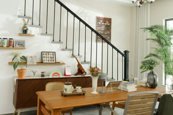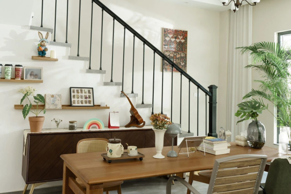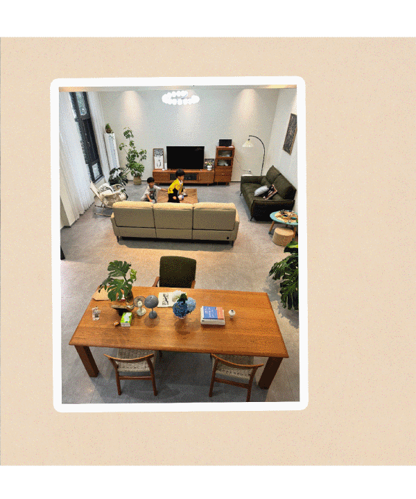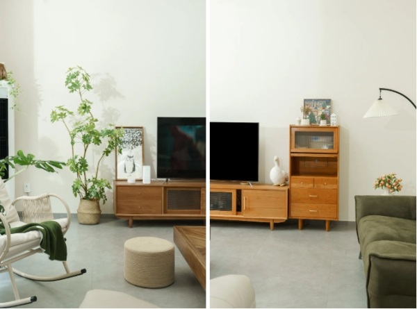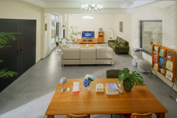 原木質地的餐桌、茶幾、電視柜把整個休閑會客區域連成一體,搭配上簡約風格的沙發和休閑椅和點綴的片片綠植,一比一還原了童話世界里恬靜美好的生活狀態。