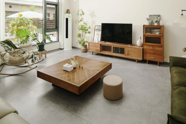 在客廳中,童話般絢爛的色彩與小巧精致的物件,與地磚巧妙地編織出一幕幕引人入勝的故事篇章。淺灰色地磚如同一條沉穩、安靜的主線,貫穿整個空間,為故事奠定了寧靜而深邃的基調。
