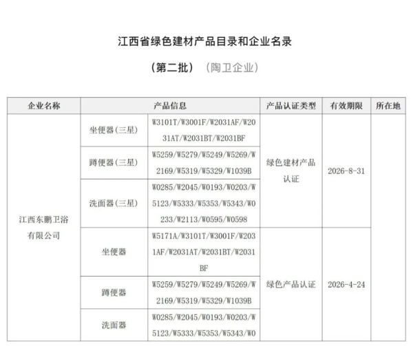 △ 東鵬整裝衛浴入選江西省綠色建材產品目錄和企業名錄