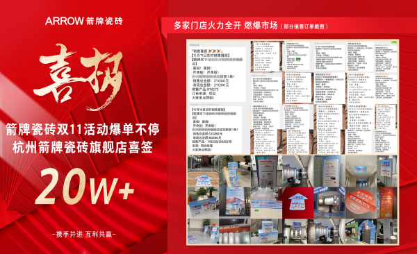隨著活動的不斷開展,箭牌瓷磚憑借質(zhì)感產(chǎn)品與優(yōu)質(zhì)服務(wù)受到用戶的關(guān)注。其中杭州箭牌瓷磚旗艦店喜簽20w+大單,其他區(qū)域門店更是熱銷不停,訂單數(shù)不斷上漲。