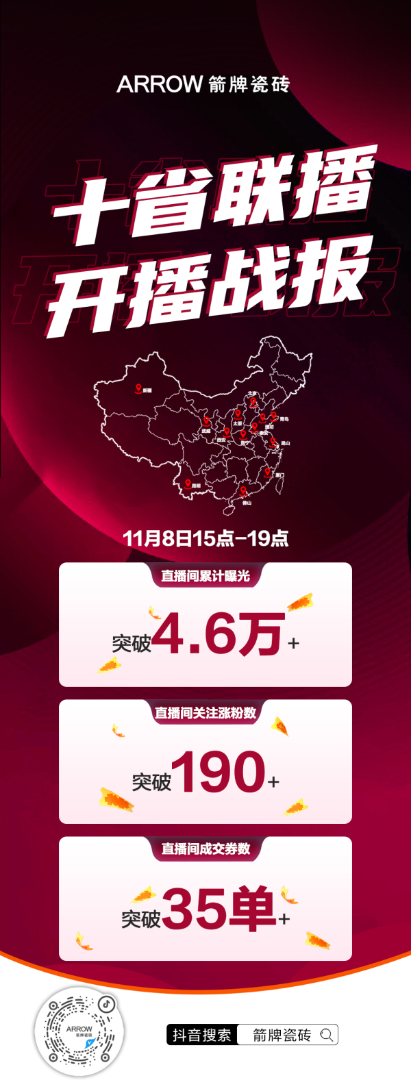 為了回饋粉絲們的支持,11月8日,箭牌瓷磚以總部為中心,聯(lián)動十個省份區(qū)域進行抖音直播,全國范圍內(nèi)開啟裂變式引流拓客,真正實現(xiàn)了廠商攜手,共同打造強大的直播矩陣。