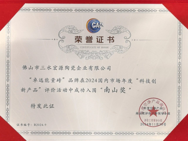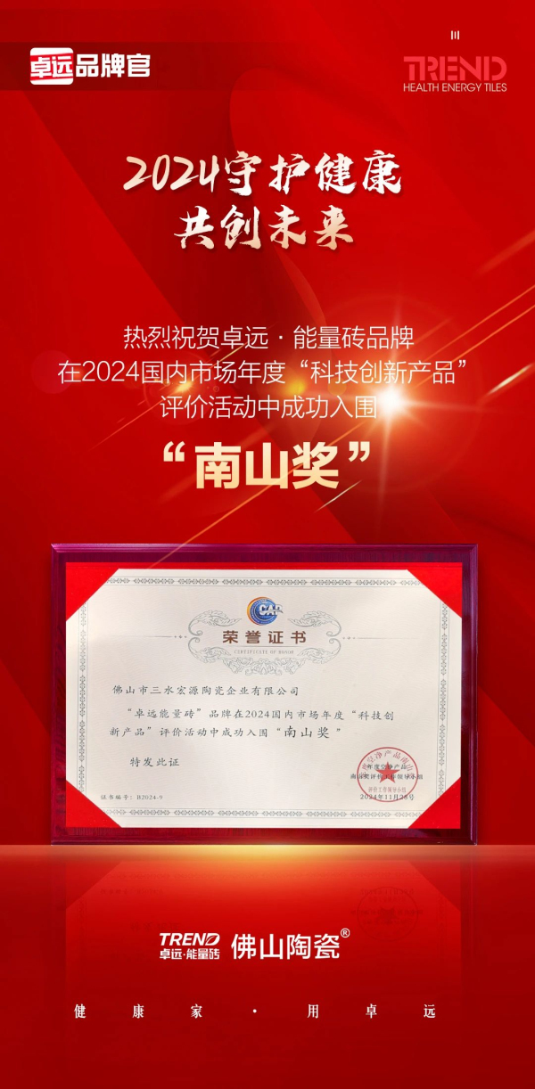 此次活動,聚焦空凈領域內的科技創新產品,旨在表彰在健康人居領域做出突出貢獻的優秀品牌。經過嚴格的評選標準和全國網友的票選,“能量瓷磚發明者”卓遠·能量磚憑借強勁實力,在2024國內市場年度“科技創新產品”評價活動中成功入圍“南山獎”。這一榮譽不僅是對卓遠·能量磚在建材行業的科技創新能力的認可,更是對其在健康瓷磚領域持續創新研發的肯定。