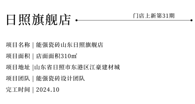 能強瓷磚懷著對美好生活的期許,巧妙將設計與體驗兩者兼具;以溫潤醇厚的大地色系為主基調,將黃海之濱的雄渾與柔美精妙融合并引入室內,創造出獨具一格的能強瓷磚日照旗艦店。