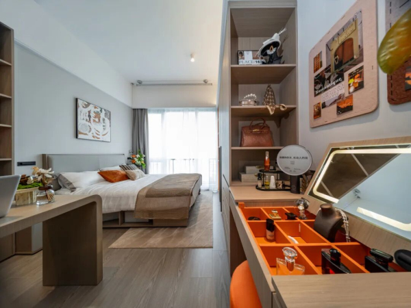 高飽和度的 “愛馬仕橙 + 普拉達綠” 打破了公寓 “千篇一律白墻” 的刻板印象,既打造出有記憶點的視覺標識,又通過色彩心理學傳遞活力與優雅,滿足女性對 “居住美學有表達” 的需求;梳妝臺不再是單一家具,而是升級為 “梳妝鏡 + 分層收納格” 的功能模塊,解決美妝用品雜亂問題;傳統沙發被直播桌替代,為女主播、線上學習者提供專業空間;創新的 “L 型收納柜” 則直擊女性 “衣物多、收納難” 的痛點,讓空間利用更高效;樓層公共區域溫馨化布置等設計,進一步強化了女性租客的居住幸福感。