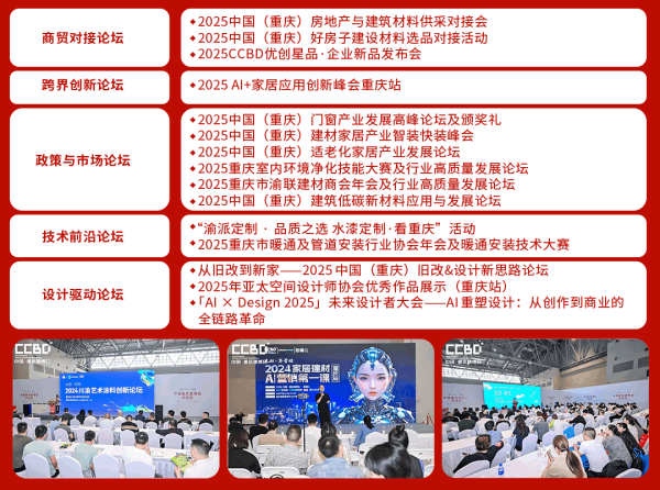 2025CCBD中國重慶建博會進一步強化專業引領,廣聚行業賢才,搭建起跨領域的專業交流圈層。展會攜手各大行業商協會、權威媒體及企業單位,緊扣產業趨勢、產品走向、舊改局改、以舊換新、適老家居、出海貿易、設計師活動、整裝快裝、新媒體營銷等熱點話題,精心策劃18+場專業行業活動,全力打造產業思想碰撞與交流的高地。