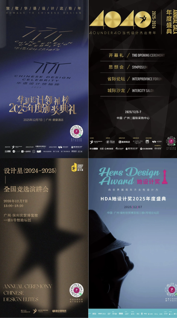 不同年齡層、不同性別群體的設計需求與審美差異,以及不同地域設計力量的多姿多彩,我們必須安排,相關活動包括:華語設計領袖榜2025年度頒獎典禮、40 UNDER 40當代設計杰出青年(2025-2026)年度盛典、設計星(2024-2025)全國競選演講會、HDA她設計獎2025年度盛典、30 UNDER 30原創設計年度新秀同期活動……等。