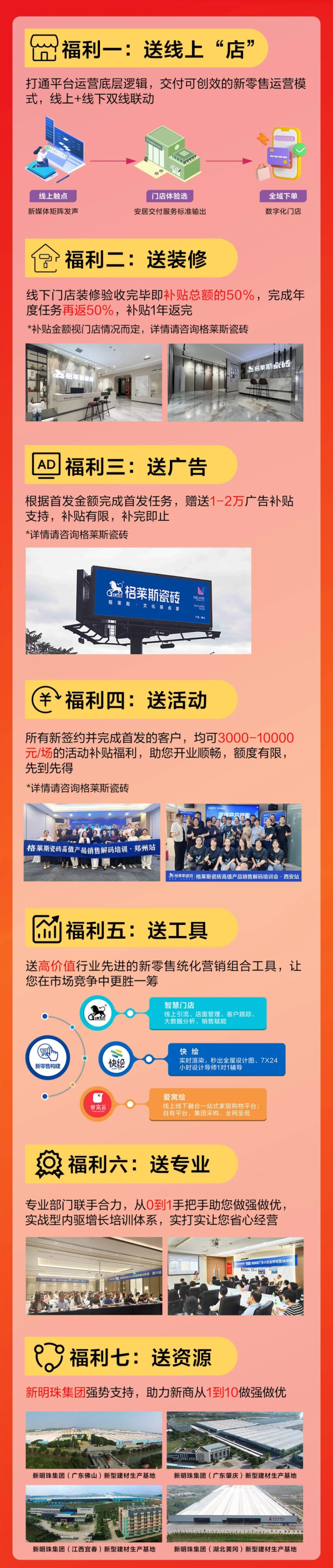 格萊斯瓷磚本次的招商計(jì)劃聚焦新媒體渠道,利用“抖音、視頻號(hào)、騰訊搜索”三大引擎聯(lián)動(dòng),充分發(fā)揮互聯(lián)網(wǎng)優(yōu)勢(shì),精準(zhǔn)觸及更多潛在客戶。同時(shí),品牌更推出創(chuàng)富7連送,助力新商快速盈利,還給予專業(yè)幫扶指導(dǎo)助力新商成長。