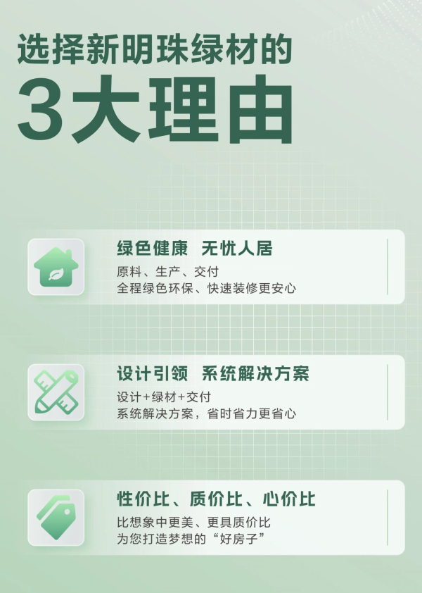 以綠材之名,踐行低碳綠色環保可持續的使命,新明珠綠材應勢而生。緊跟新明珠集團的戰略目標,新明珠綠材致力于成為綠色建筑空間和美好人居生活提供解決方案的服務商。依托“設計研究 + 綠建新材 + 精工交付”的新明珠“N+N”整體空間解決方案,助力人們實現對健康人居環境和美好生活的追求。