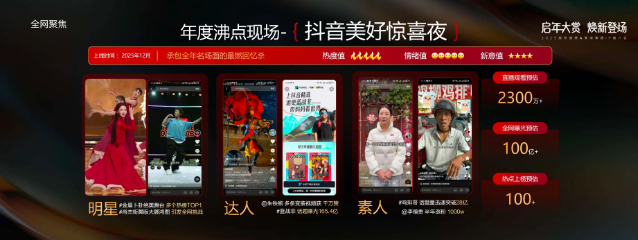在跨年節點,跨年晚會和跨年演唱會是最受年輕人歡迎的儀式。「抖音美好驚喜夜」是抖音平臺的跨年晚會,既有過去一年抖音上各種名場面、標志性人物集體回憶殺,又會制造大量新熱點上榜,百億級曝光,熱度值和歡樂值拉滿,情緒普適性高,非常適合品牌打開認知度、好感度。