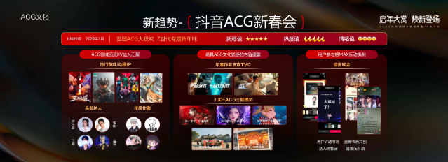 2026年抖音將舉辦首屆ACG新春會大聯歡,邀請王者榮耀、三角洲等頂流IP合作,眾多頭部達人加入,豐富的內容和互動參與機制將驚喜滿滿。眾所周知二次元的消費力驚人,也是許多品牌重點關注的圈層人群,這樣一場屬于二次元自己的春晚也將是品牌攻略二次元人群的好機會。