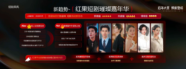 短劇愛好者有福了,新年之際將迎來「紅果短劇璀璨嘉年華」,屆時將舉辦首屆紅果短劇演員打榜盛典,通過20天的線上投票以及一場超長拉票直播借力,由觀眾票選出年度最受歡迎的短劇和演員,并舉辦盛大的頒獎典禮。與此同時,紅果將推出全新的招商劇模式,品牌合作門檻更低、合作空間更大、內容玩法更多元,對于有志于短劇營銷的品牌而言十分值得關注。