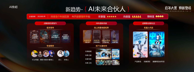 科技硬核愛好者也有自己的“春晚”,抖音將舉辦首次「AI未來合伙人」活動,邀請官方機構、媒體以及專家達人共同進行AI相關知識科普,通過線上科普內容和線下AI嘉年華結合,打造一場科技盛典。結合IP項目,平臺將推出機器人代言新玩法,通過產品聯名、形象授權、進入直播間互動等形式,讓 AI賦能營銷。
