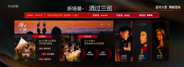 春節期間,巨量引擎也推出了多個以家庭為場景的內容IP,為不同垂直行業的品牌提供定制化的營銷場景。「酒過三巡」以“喝一杯”為打開溝通的鑰匙,老中青三代嘉賓在飯桌上通過舉杯間的真誠對話,達成共鳴與和解,適合酒水品牌進行年輕人群溝通。