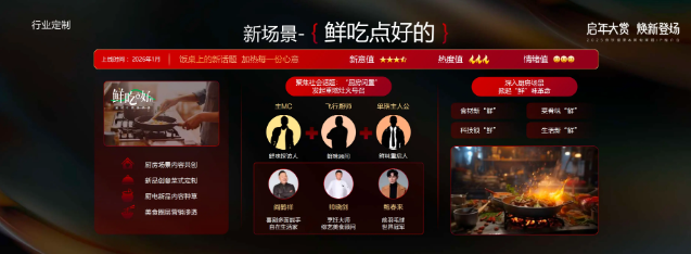 「鮮吃點好的」則是走進年輕人被閑置的廚房,通過重燃廚房的灶火幫助他們重啟鮮活的生活,對于食品飲料、調味品、廚房用品等品牌均有種草空間。