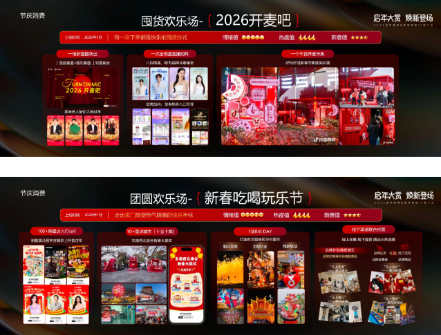 針對年輕人的喜好,抖音將在春節期間推出多個既有好東西、好價格又有歡樂好體驗的IP項目,滿足用戶邊玩邊買的訴求。例如,抖音電商年貨節將推出「2026開麥吧」IP,邀請喜劇界、音樂界的頂流藝人一起陪大家大笑過年,并且會進入品牌直播間陪大家一起挑選年貨,讓每一次下單都是快樂的囤貨儀式。此外,抖音本地生活服務將推出「新春吃喝玩樂節」,邀請100個以上的明星達人一起走出家門展開一場全國范圍的吃喝玩樂狂歡,抖音將在全國50多個重點城市設立線下歡樂場,和各地廟會結合起來提供熱鬧年味和豐富體驗,將為本地商家帶來巨大流量機會。