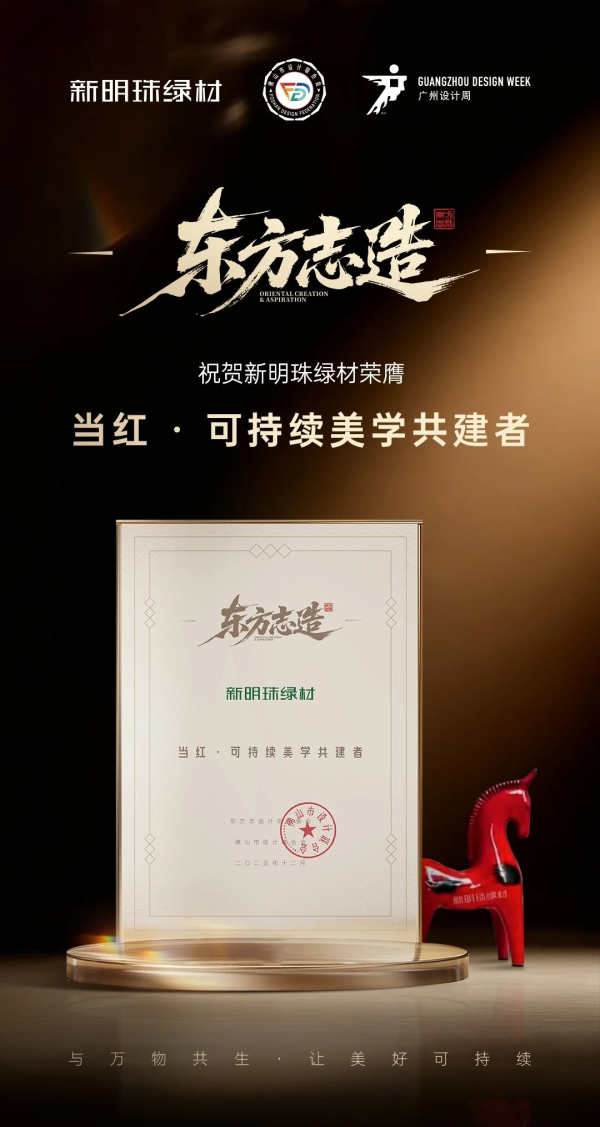 基于在綠色材料研發與美學價值創造方面的持續貢獻,新明珠綠材在授牌儀式中榮膺“當紅•可持續美學共建者”稱號。這一榮譽是對品牌堅持“科技、綠色、美學”融合發展戰略的權威認可。