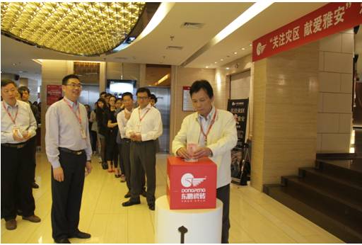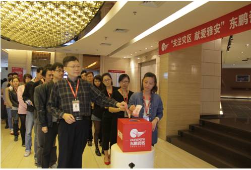 “關(guān)注災(zāi)區(qū),獻(xiàn)愛雅安”在東鵬總部募捐點,員工紛紛獻(xiàn)出愛心