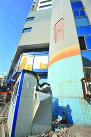 記者隨后趕到現場看見,振業大廈西南側的藍色瓷磚外墻上,一塊兩米多高、一米多寬的墻皮已經脫落,將離墻一米多遠的一個看車棚砸碎。記者在紅色布條拉起的隔離線外看見,看車棚被砸得“皮開肉綻”,彩鋼板內的泡沫塑料已經脫落,地上散落著不少巴掌大小的藍色瓷磚。記者注意到,停車棚里有一張小桌,上面的熱水瓶蓋、飯勺和碗碟都被砸到了地面。
