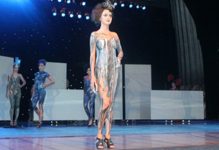 建筑作為城市的外衣,裝飾了城市,而瓷磚則裝飾了建筑,對于人類來說,服裝作為人類的外衣裝飾了自己。服裝與建筑、瓷磚有異曲同工之妙。在簡一石尚秀環節,簡一大理石瓷磚通過服裝的形式,從材質的選取,到服裝的設計,到顏色的差異,給現場2500名觀眾帶來了區別于行業的視覺盛宴。與此同時,8名來自意大利和俄羅斯的外國彩繪模特,身上繪制簡一形象產品:寶石藍、法國流金、銀灰洞、水草瑪瑙將簡一產品逼真的特點顯露無遺。彩繪與石尚秀的結合方式突破了建陶行業的常規產品展示方式,通過這種別樣的展示方式,逃離了瓷磚給人的冰冷感,將人對瓷磚的“泥巴印象“賦予了時尚感,革新了行業產品展示和發布的方式,在行業尚屬首次!