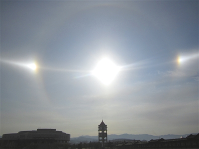 昨日9時許,內蒙古赤峰上空出現日暈和幻日現象,持續時間約1小時。 新華社發