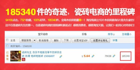 2012年6月,瓷磚先生木紋磚銷量累計(jì)超5萬件,穩(wěn)居淘寶全網(wǎng)木紋磚銷量冠軍。