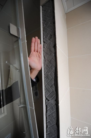 “房子才入住不到一個月,竟出現這種問題。”陳先生稱,早在交房的時候,自己就發現浴室以及陽臺外多處墻體有空鼓的現象,并向開發商反映,但對方雖然答應整改,卻遲遲沒有行動,“這次瓷磚脫落,明顯就是空鼓造成的,瓷磚沒貼緊,在玻璃門的重力之下,就脫落了。”