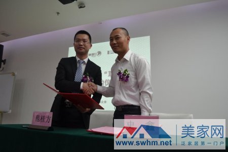 施瑯陶瓷總經理范桂方(左)和今日傳媒史鑫(右)簽約儀式