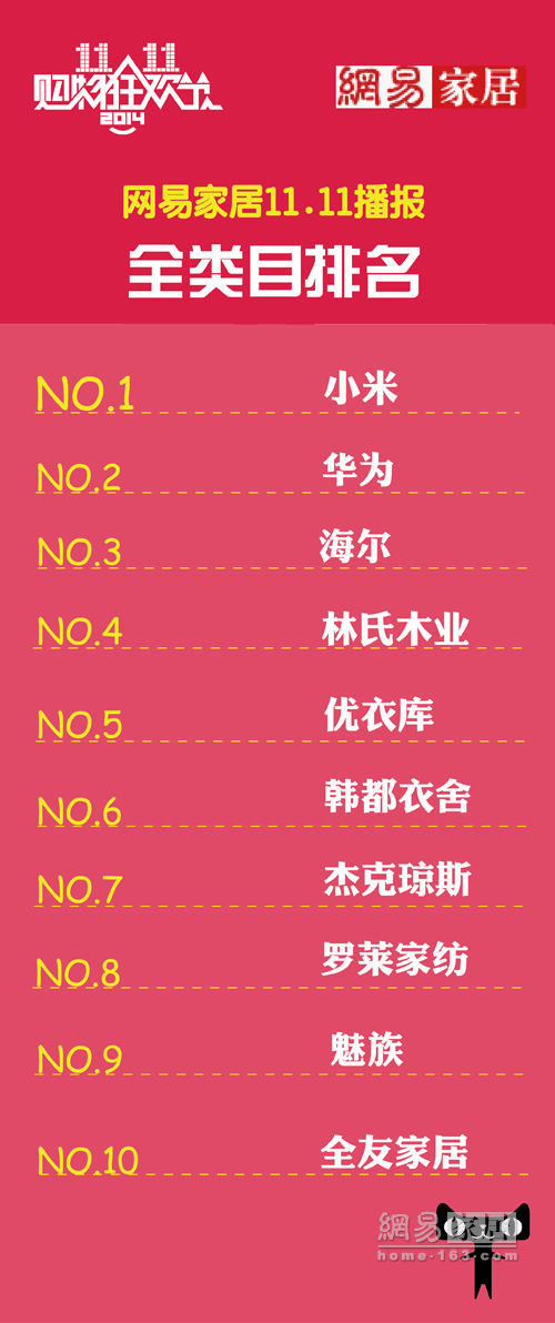 林氏木業最終排在天貓全類目銷售第四,同樣進入前十的還有羅萊家紡、全友家居。據阿里公布的消息,最終全類目排名為小米、華為、海爾、林氏木業、優衣庫、韓都衣舍、杰克瓊斯、羅萊家紡,魅族、全友家居。羅萊家紡“雙十一”銷售額排在全類目第八,這個11月11日當天開售10小時破億的家紡類品牌,在家紡類目居首位。據羅萊家紡在天貓上掛出的數據顯示,截止22時37分,其成交額已達1.5億元。而2013年,羅萊以6926萬元的金額排在家紡類第四。實際上,2012年“雙十一”,羅萊家紡就排在家紡類第一,其在官方微博上公布“單店成交金額突破9000萬,成交約23萬筆,在家紡類排名第一”。但此后羅萊家紡被質疑刷單,彼時有網友稱,羅萊公布的銷售額,與數據魔方的檢測到的53,380,999元有差距。由于有“刷單”的“前科”,有消息人士稱,今年羅萊家紡誓不刷單。
