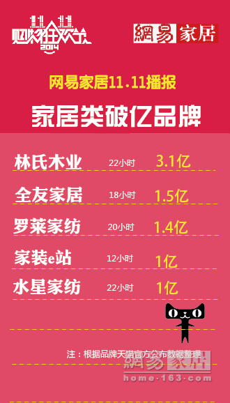 除了林氏木業、羅萊家紡和全友家居,泛家居類品牌還有2家銷售額破億,分別為水星家紡和家裝e站。數據顯示,截止12時,天貓已有12家商家成交額超1億元,42家商家成交額超5000萬元,其中,3家居品牌破億。隨后12時11分,家裝e站宣布成交額破億。水星家紡也在11.11晚上宣布銷售業績破億,至此,家居類破億品牌已達5家。