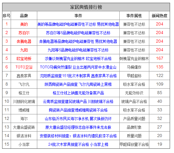 近期,有不少企業被曝產品質量問題,遭到消費者屢屢投訴。消費點評網通過各大主流裝修門戶、新浪微博、天涯、貓撲等主流論壇收集到10月16日到10月31日產品質量問題報道及網友投訴。 一、家居行業品牌輿情排行榜 10月16日到10月31日,消費點評網家居輿情排行榜監測到等品牌在質量和服務等方面的問題。其中,不少品牌產品存在等問題。 (數據來源:各大主流裝修門戶網站、天涯、貓撲等論壇社區、新浪微博等)